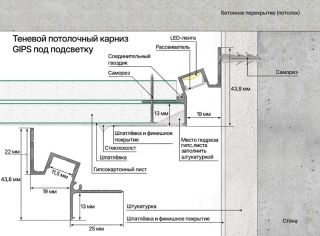 Алюминиевый профиль для потолка, сделан из алюминия, цвет чёрный. Отступ от стены 19 мм. Размер профиля 42,5*37*3000 мм. Для ГКЛ листов 12,5 мм. Можно использовать с подсветкой.